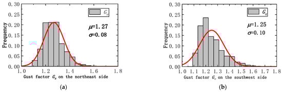 Statistical distribution of the gust factor Gv in the crosswind direction: (a) the northeast side; (b) the southwest side.