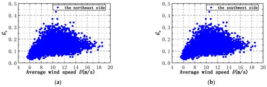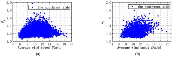 The scatterplots of Gu and U for the two measurement points on the southwest and northeast sides are shown in Figure 19. The scatterplots of the two measurement points on the northeast and southwest sides have similar distribution forms. The main manifestation is the consistent rule of the upper and lower limits of Gu. The upper limit increases with increasing wind speed for mean wind speeds less than 11 m/s and decreases with increasing wind speed for mean wind speeds greater than 11 m/s. The lower limit is always stable around 1.1 as wind speed increases.