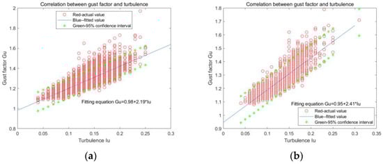 Correlation between gust factor and turbulence: (a) the northeast side; (b) the southwest side.
