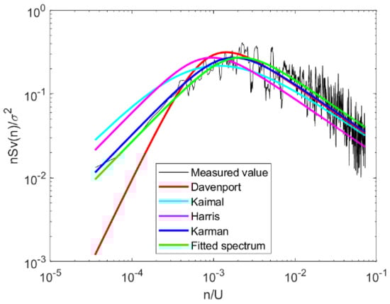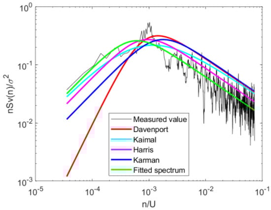 where n is the frequency; is the measured spectrum value downwind; Lu is the integral scale; σu is the standard deviation of the fluctuating wind in the downwind direction, ; z is the height at a given location; is the wind speed at height z; is the wind speed at 10 m; α is the wind profile index, which is taken as 0.21 based on the actual measurement results; and A and B are the parameters to be fitted.