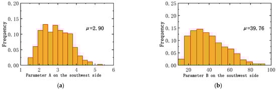 Fitting parameters on the southwest side: (a) parameter A; (b) parameter B.