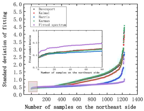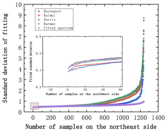 However, in terms of the minimum sample standard deviation corresponding to several spectra, the fitted spectrum was not advantageous. Particularly for the northeast side, the standard deviation of the fitted spectrum was consistently larger than the other empirical spectra in the region with the smallest sample standard deviation. Other empirical spectra, however, showed a large divergence in standard deviations and a decreasing applicability as the sample size increased.