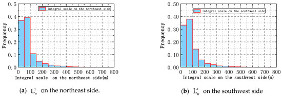 Frequency statistical histogram of the integral scale: (a) on the northeast side; (b) on the southwest side.