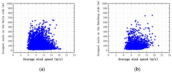 Relationship between turbulence integral scale and mean wind speed: (a) the northeast side; (b) the southwest side.