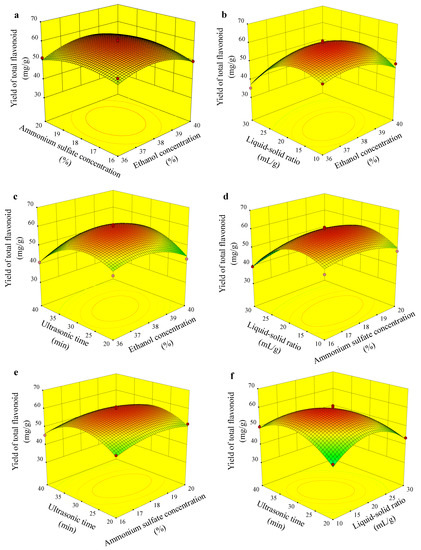 | No. | Mass Fraction of Ethanol (%) | Mass Fraction of Ammonium Sulfate (%) | Concentration of Enzymes (U/g) | Enzymolysis Time (min) | Enzymolysis Temperature (°C) | Ultrasonic Time (min) | Liquid–Solid Ratio (mL/g) | Yield of Total Flavonoids (mg/g) |