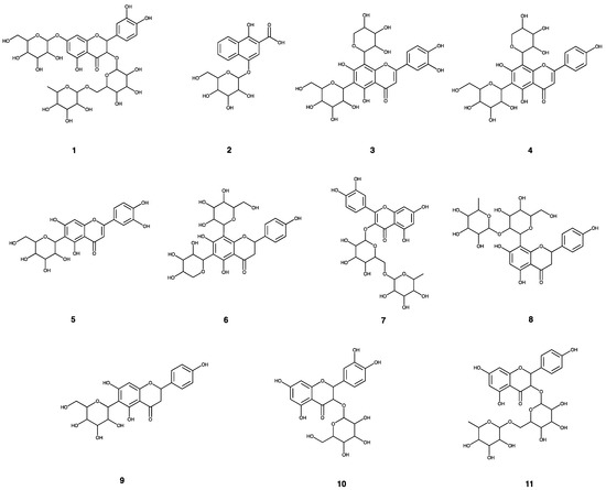 - Batista, M.T.; Gomes, E.T. C-glycosylflavones from Ceratonia siliqua cotyledons. Phytochemistry 1993, 34, 1191–1193. [Google Scholar] [CrossRef]