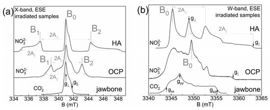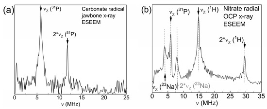 ESEEM spectra of irradiated jawbone containing HA (a) and OCP (b) samples registered in a perpendicular orientation (B0) of carbonate and nitrate radicals, respectively (see Figure 1a).