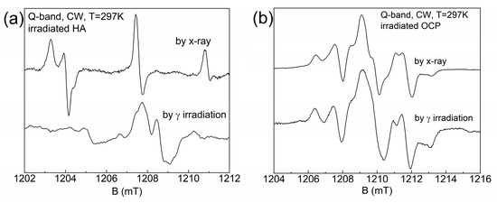 Samples irradiated by X-ray and γ-radiation were additionally explored in the Q-band microwave range. Experimental results are presented only in continuous wave mode at room temperature. Figure 2 shows the difference in the EPR spectra between the types of irradiation for the same type of material. The nature of the paramagnetic centers can be dependent on the type of radiation exposure. The influence of the type of radiation (and other radiation characteristics) on the EPR spectrum was extensively discussed in the literature [56,57]. However, for the OCP sample, the difference in the EPR spectra according to the type of irradiation is not observed. It may serve as additional proof to the conclusion made in ref. [54] that, in contrast to HA, the radiation-induced radicals in OCP are stabilized not in the apatite, but in the hydrated layers of OCP.