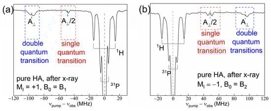 Total EDNMR spectra of HA according to the quantum number MI: (a) MI = +1 at B0 = B1, (b) MI = −1 at B0 = B2 (see Figure 1a).
