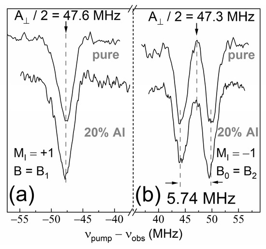 EDNMR spectra for the single quantum transition according to the quantum number MI: (a) MI = +1 at B0 = B1, (b) MI = −1 at B0 = B2 (see Figure 1a).
