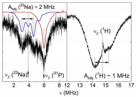 A more detailed analysis of the spectrum at ∆ν > 0 (MI = −1) shows an additional splitting for the single-quantum transition exactly localized at the value A⊥/2 (Figure 4). Using the expression for single-quantum transitions [58]: