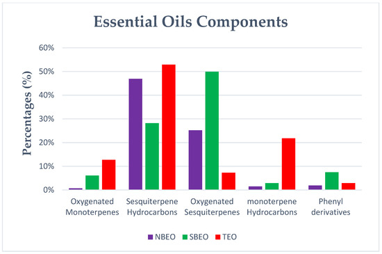 Pimpinella lutea essential oils consisted of monoterpenes and sesquiterpene hydrocarbons, oxygenated sesquiterpenes and phenyl derivatives, as shown in Figure 2.