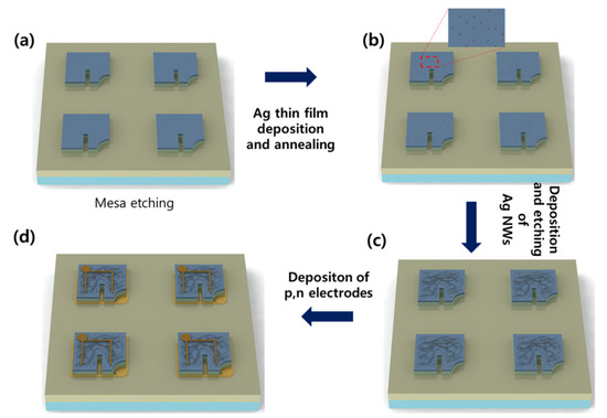 Schematic illustrations and images corresponding to steps for the fabrication of GaN LEDs with Ag-NW/NP-based TCE. (a) To fabricate LEDs 500 × 500 µm2 in size, the p-GaN and MQWs were sequentially etched using inductively coupled plasma with boron trichloride gas until n-contact layer was exposed. (b) Ag films with thicknesses of 1 nm were selectively deposited by e-beam evaporation on the p-GaN and annealed at 500 °C for 1 min in nitrogen ambient to form Ag NPs. (c) Ag NWs were chemically synthesized according to a previously reported method [19], dispersed in deionized water, and deposited by spin-coating method to obtain a flat film. After photolithography to form TCE region, the Ag NWs were etched using a dilute diluted nitric acid solution of HNO3/H2O (10:1). For a comparative study, a Ag NW layer without NPs was deposited. To form an Ohmic contact, the coated Ag NW layers were annealed at 150 °C for 10 min in nitrogen ambient. (d) Cr/Au was deposited on TCE and n-GaN by e-beam evaporation to obtain n- and p-pads.