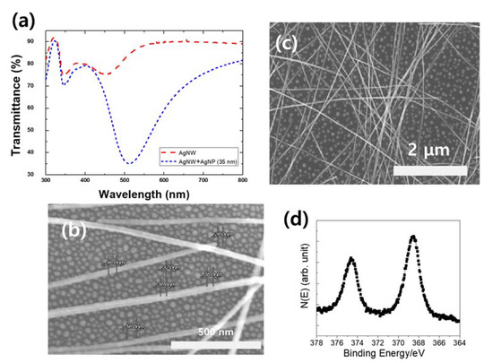 (a) Transmittance of Ag NW and Ag NW/NP TCEs for different NP sizes. FE-SEM images of Ag NW/NP TCEs with NP size with (b) 2 μm scale bar and (c) 500 nm scale bar, (d) XPS spectrum of Ag NW/NP TCE.