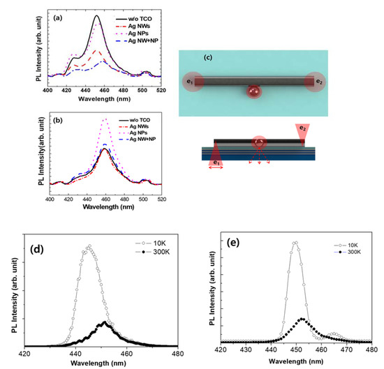 PL spectra of GaN LEDs with (a) 120 nm thick and (b) 45 nm thick p-GaN layer without TCE and with Ag NW, Ag NP, and Ag NW/NP TCEs and (c) schematic diagram of light extraction by plasmon leakage radiation and PL spectra with GaN LED (45 nm thick p-GaN layer) (d) without TCE and (e) with Ag NW/NP TCE at 10 K and 300 K.