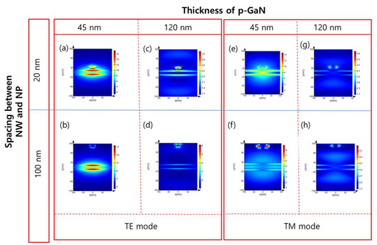 FDTD simulation of Ag NW/NP TCEs using sapcing between the Ag NW and Ag NP of 20 nm with (a) 45 nm and (c) 120 nm-thick p-GaN for TE mode and (e) 45 nm and (g) 120 nm-thick p-GaN for TM mode. That of of Ag NW/NP TCEs using sapcing between the Ag NW and Ag NP of 100 nm with (b) 45 nm and (d) 120 nm-thick p-GaN for TE mode and (f) 45 nm and (h) 120 nm-thick p-GaN for TM mode.