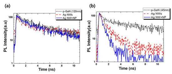 Time-resolved PL spectra of blue LEDs without TCE and with and without Ag NPs with (a) 120 nm thick and (b) 45 nm thick p-GaN layer.