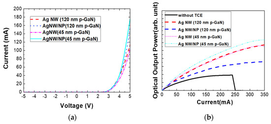 (a) Current–voltage characteristic and (b) optical output power of LED with Ag NW and NW/NP TCEs.