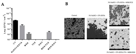 (A) Viable cell counts of Candida albicans SC 5314 biofilms performed after 24 h of aerobic incubation at 37 °C. Values of cultivable sessile cells were expressed as Log CFU per area (cm2). (B) SEM analysis of the development of 24-h biofilms of C. albicans SC 5314 after exposure to the conventional final irrigation protocol (3%NaOCl + 17%EDTA) followed by the solvent mixtures (MEK/TCE or MEK/OOil).