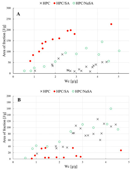Finally, we compared all FW, FBW, and NFW fractions of water obtained for raw HPC, HPC/SA, and HPC/NaSA mixtures to Wc, as shown in Figure 11A–C, respectively.