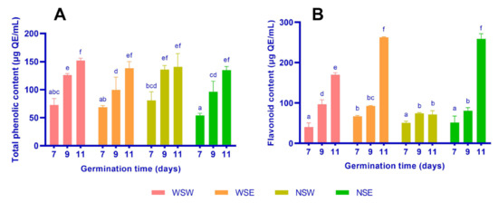 Total phenolic (A) and flavonoid (B) contents of Korean waxy and normal wheat sprouts germinated for 7, 9, and 11 days. WSW, water extracts of the waxy wheat sprouts; WSE, 80% ethanol extracts of the waxy wheat sprouts; NSW, water extracts of the normal wheat sprouts; NSE, 80% ethanol extracts of the normal wheat sprouts. Values are shown as mean ± SD (n ≥ 3). Values with a same letter (a–f) are not significantly different by Duncan’s multiple range test (p < 0.05).