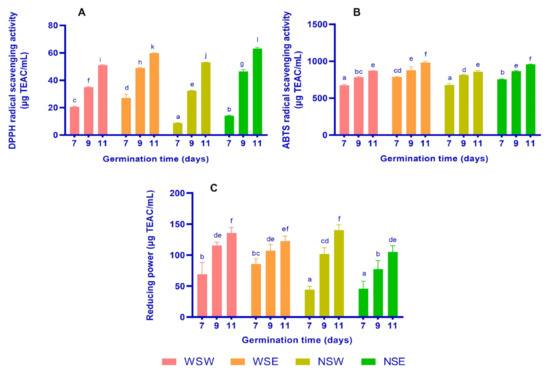 Antioxidant activities of Korean waxy and normal wheat sprouts germinated for 7, 9, and 11 days. (A) DPPH radical scavenging activity; (B) ABTS radical scavenging activity; (C) Reducing power. WSW, water extracts of the waxy wheat sprouts; WSE, 80% ethanol extracts of the waxy wheat sprouts; NSW, water extracts of the normal wheat sprouts; NSE, 80% ethanol extracts of the normal wheat sprouts. Values are shown as mean ± SD (n ≥ 3). Values with a same letter (a–l) are not significantly different by Duncan’s multiple range test (p < 0.05).