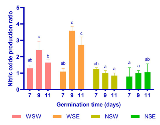 Nitric oxide production ratio in MEF cells treated with Korean waxy and normal wheat sprouts germinated for 7, 9, and 11 days. WSW, water extracts of the waxy wheat sprouts; WSE, 80% ethanol extracts of the waxy wheat sprouts; NSW, water extracts of the normal wheat sprouts; NSE, 80% ethanol extracts of the normal wheat sprouts. Values are shown as mean ± SD (n ≥ 2). Values with a same letter (a–d) are not significantly different by Duncan’s multiple range test (p < 0.05).