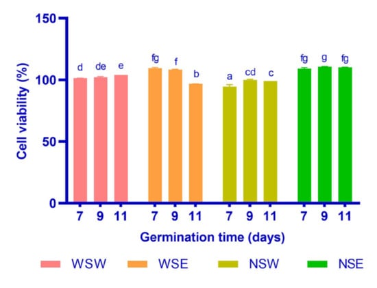 The viability of Caco-2 cells treated with water and 80% ethanol extracts of Korean WS and NS germinated for 7, 9, and 11 days is presented in Figure 4. The cell viability after the treatment with the water extracts of WS and NS increased with germination time, and it was higher for the water extracts of WS than that of NS. Treatment with 80% ethanol extracts of WS decreased the cell viability with germination time, while that of NS did not exhibit a significant difference over time. The cell viability after the treatment with ethanol extract were higher for NS than WS after 9 days of germination, in contrast to the water extract. However, all extracts exhibited more than 90% cell viability, thereby implying that all extracts of WS and NS did not exhibit cell toxicity. The sample is considered non-cytotoxic if it does not reduce the cell viability below 85% [38].