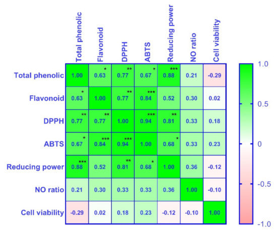 Pearson’s correlation coefficient between the total phenolic and flavonoid contents, and various bioactivities including antioxidant and anti-inflammatory activities and cell viability determined for WS and NS is exhibited in Figure 5. As mentioned previously, phenolic compounds and flavonoids are natural antioxidants of plant materials [21,22]. Therefore, positive correlations were found significantly between total phenolic and flavonoids contents with all antioxidant activities determined by three different assays, which are DPPH, ABTS, and reducing power assays. These three different assays also exhibited significant correlation between each other. The linear correlation between phenolics and flavonoid contents with radical scavenging activity and reducing power in plant material was reported previously [46].