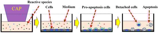 The earliest attempts to test the anti-cancer capacity of CAP treatment were conducted using direct treatment. Direct treatment is also the most conventional approach []. It is based on a simple assumption that a treatment should be performed when cells are in culture conditions or at least in an environment close to that of the standard culture conditions. A layer of medium covered cells during most studies involving direct CAP treatment []. Because thermal irradiation, UV irradiation, and EM emission may be blocked by this layer of medium, particularly when this layer is adequately thick, the physical effect has not been noted in most previous studies. This medium layer also plays the role of an interface between the gas phase of CAP and aqueous solutions []. Without such an aqueous environment, many reactions may be interfered with or fully blocked.