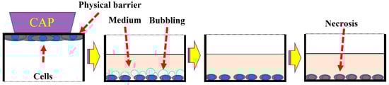Schematic illustration of a physical-based CAP treatment in vitro. Here, the feature of necrosis is used to represent the cell death pathway observed in references. Quick bubbling and cytosolic shrinkage are two key features of physical-based cell death.