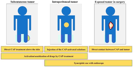 Based on the discussion above, the following predictions for possible approaches of CAP-based cancer treatment can be made (Figure 5). For subcutaneous tumors, a direct treatment strategy just above the skin of the tumor site is recommended. Based on the observation from physical-based CAP treatment in vitro, we speculate that even an air gap, such as several mm between bulk CAP and the skin, will not fully weaken the treatment’s efficacy. In contrast, the efficacy of treatment may be fully inhibited when bulk CAP completely touches the skin too closely. For intraperitoneal tumor or tumors residing in deeper tissues, simply treating the skin is a questionable approach based on the current evidence and conclusions. If considering the anti-cancer capacity due to physical factors, the effective penetration depth remains unknown. PAS or PAM may be used to treat the tumor in such cases by administering subcutaneous or intraperitoneal injections. It is important to mention that CAP may be synergistically used with endoscopic technology to treat deep tissue tumors by a minimally invasive surgery []. In addition to these cases, CAP can also be used as an adjunct to current surgical methods. Bulk CAP can come in direct contact with the exposed tumor tissue or the remnants of tumor tissue during surgery. This direction may be another promising candidate.