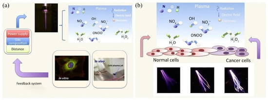 A schematic illustration of an adaptive plasma system. (a) Basic concept. A CAP treatment can trigger different responses in cancer cells and normal cells. An adaptive plasma system can collect, measure, record, and analyze these responses as signals. These signals provide a feedback signal to the system, which in turn modulates the chemical composition of CAP by controlling gas composition, power supply, the gap between the source and target, etc. (b) The target affects the discharge pattern of plasma by self-organization. For example, cancer cells and normal cells exhibit large differences in membrane potential, which can be used as a feedback signal to control plasma through the self-organization of plasma with different patterns and modes. The plasma adaptive therapeutic system through real-time cellular and tissue response can lead to optimal and selective cancer treatment ((a,b) are reproduced with permission from Keidar, Michael, et al. Trends in Biotechnology 36.6, 586–593, (2018). Copyright 2017 Elsevier Publisher. []).