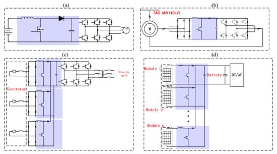 DC–DC boost converters are widely used in new energy systems, which can increase the voltage between the source and load ports [,,,]. To show the advantage of this, four main application cases are clearly introduced, which are shown in Figure 1. First, the boost converter can be adopted in battery-powered devices [], which is revealed in Figure 1a. It is known that the output voltage of a high-energy battery varies greatly under the conditions of high current charge and discharge. In particular, when the power of the battery is low, its output voltage will be very low. However, some battery-powered devices require a relatively constant voltage in the above cases. At this point, the boost converter can be placed between the battery and the electrical equipment. In that case, the voltage of the battery can be increased to the desired value required by the devices and maintained around this voltage. A practical example is an air conditioning device in a marine auxiliary system, where the power supply of the air conditioning compressor and ventilator should be from the storage battery in the case of the failure of the external power supply. It is noted that the variation range of the battery voltage is very wide. In this case, the ideal solution for the power supply is to implement a boost converter to raise the battery voltage to 510 V. Then, the inverter and AC motor are employed to drive the air conditioning compressor and ventilator.