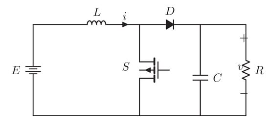 The topology shown in Figure 2 corresponds to a DC–DC boost converter. It is assumed that this converter works in continuous conduction mode (CCM). Based on the state-space averaging method proposed in [,], its averaged model is expressed as