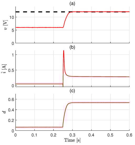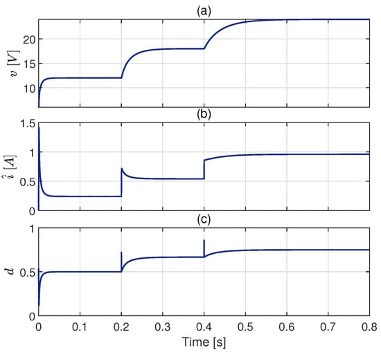 Boost converter transient under the proposed sensorless controller. (a) Output voltage v, (b) estimated current , (c) duty ratio d.