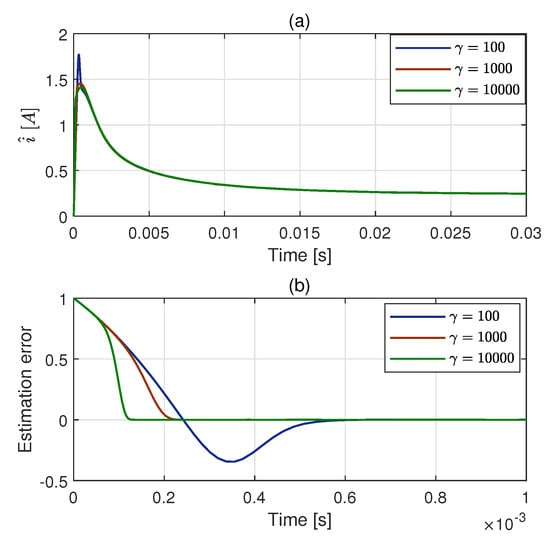The performance of GPEBO is tested in this scenario. . By selecting a different observer gain , the convergence result of GPEBO is revealed, as shown in Figure 6. One can observe that the larger results in a quicker convergence rate. Interestingly, the initial amplitude of the estimated current does not increase with the rise in the gain. The reason is that the control gain is fixed during the GPEBO performance test. In this case, the real curve of the current is confirmed. Hence, the larger observer gain only allows the estimate of the current to converge to the real value more quickly. Instead, the smaller may result in this convergence process becoming slower, which may provide a bigger initial amplitude of the estimated current. This fact is clearly shown in the figure.