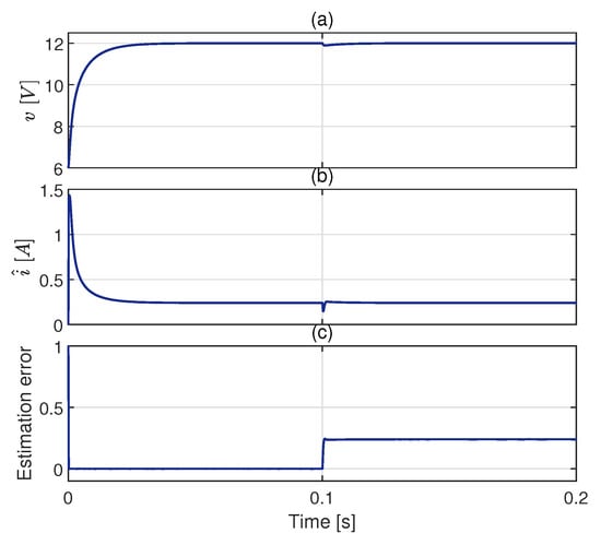 Response curves of boost converter with a step change in R. (a) Output voltage v, (b) estimated current , (c) estimation error.