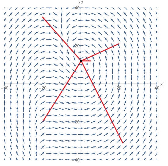 The phase portrait of closed-loop system. The black point is the equilibrium. The red lines are the state trajectories.