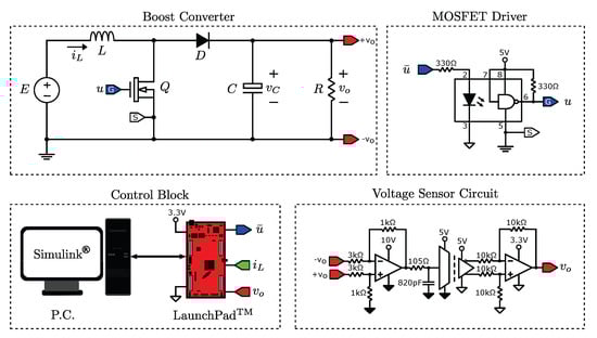 The experimental platform is implemented using a logic level IRLZ44N N-channel MOSFET from infineon in Neubiberg, Germany and an STPS10L60 Schottky diode from STMicroelectronics in Dallas, TX, USA. The 6N137 optocoupler, which is from Fairchild in Silicon Valley, CA, USA, is used as the MOSFET driver. Two TLV237 operational amplifiers and one ISO224 isolated operational amplifier, which are produced by Texas Instruments in Dallas, TX, USA. are implemented to condition the output voltage vo in order to be measured by the DSP. The schematic diagram of the experimental platform is shown in Figure 9.