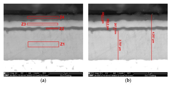 Coating characterization: (a) identification of the different layers (Z1—CrN, Z2—DLC, Z3—CrN, Z4—DLC); (b) thickness measurement of the coating.