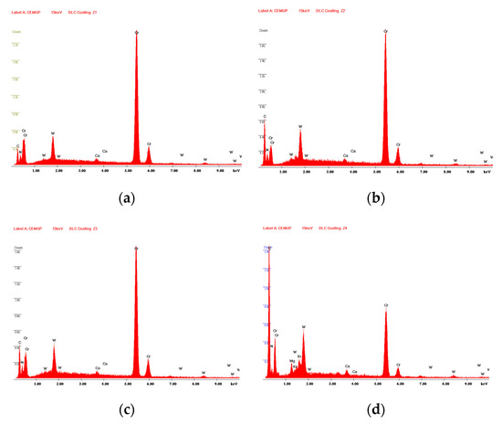 As can be observed in Figure 2a, the coating is composed of four layers, each of these was subjected to EDS analyses and their chemical compositions were determined. The spectra obtained from these can be observed in Figure 3.