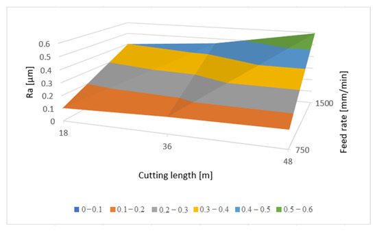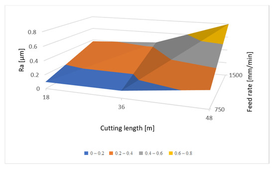 As seen from the figures and table presented above, the values of the surface roughness tend to rise for higher values of feed rate and cutting length. For the condition of 1500 mm/min, the surface roughness values were the highest for both tools. Although the behavior of the surface roughness values was the same for both coated and uncoated tools, the lowest values of surface roughness were detected for the coated tools for cutting lengths up to 36 m. However, for the maximum cutting length conditions (48 m), the uncoated tools produced a better surface finish on the machined material when compared to the coated tool. A bar graph comparing the surface roughness of both of these tools for each of the tested conditions can be observed in Figure 6.