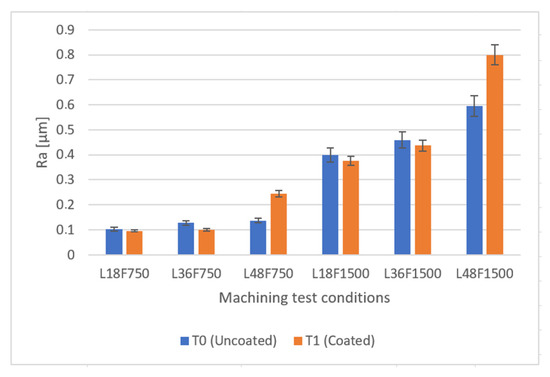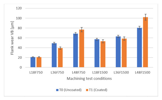 Similar to what was registered for the uncoated tools, the minimum values of flank wear were obtained for lower cutting lengths and feed rate values. Additionally, as was registered in the surface roughness analysis, the coated tools suffered less wear than the uncoated ones for cutting lengths of up to 36 m, for both the feed rate values of 750 mm/min and 1500 mm/min. This comparison can be observed in the form of a bar graph in Figure 13.