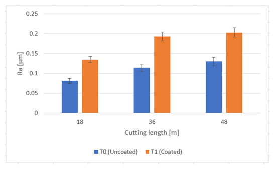 Trying to analyze the influence of feed rate on the produced machined surface quality, some additional tests were conducted. These tests were performed at a 350 mm/min feed rate and with a 48 m cutting length. Three tests were conducted for each tool, uncoated and coated, analyzing the behavior of the machined surface roughness from the beginning of the test until it reached a cutting length of 48 m. In Figure 7, the evolution of surface roughness for both coated and uncoated tools can be observed.