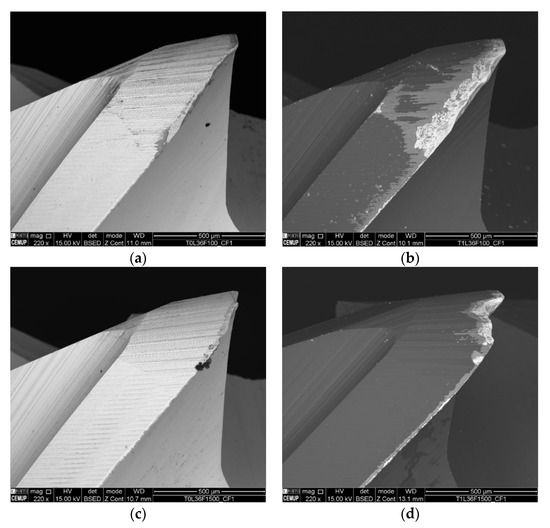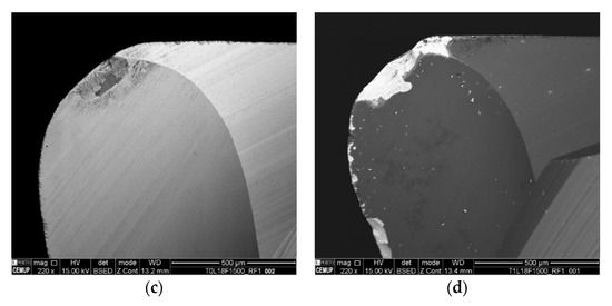 Figure 17a,b presents the main wear mechanisms registered in the uncoated tools; more specifically, for uncoated tools tested at a cutting length of 48 m and feed rate values of 750 mm/min and 1500 mm/min. Once again, the presence of adhered material was found, that was deposited in the craters caused by machining. It can be observed that, for higher feed rate values, adhesive wear was more severe. In Figure 17b, it can be observed that the material adheres to the top of the tool, compromising the machined surface quality. Furthermore, the substrate suffers considerably more damage for higher feed rates, with the cutting edge breaking and chipping being registered.