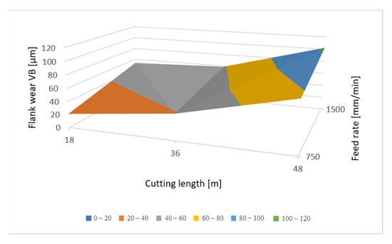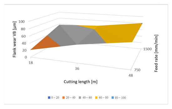 Surface graph of the mean value of measured flank wear (VB) of the coated tools for each of the tested conditions.