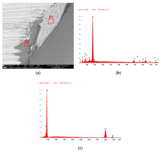 The coated tools were also subject to adhesive damage, as can be observed in Figure 14, in the Z4 area. In addition to the wear mechanism registered in the uncoated tools, these tool types suffered coating delamination, caused primarily by the adhesion of material to the tools’ surface. Figure 15 shows that the tool suffered substrate exposure, as well as outer layer delamination, as seen in Z2, which corresponds to the intermediate CrN layer. EDS analysis carried out on this tool can be observed in Figure 16.