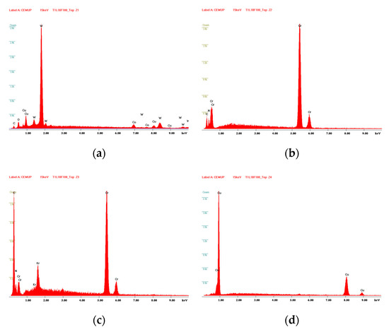 EDS spectra of Figure 16 zones: (a) Z1; (b) Z2; (c) Z3; (d) Z4.