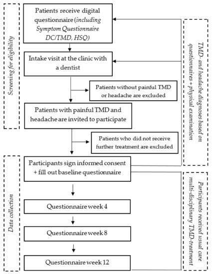 Patients were eligible when they had: (1) TMD-pain diagnosis; (2) headache complaints in the last year; (3) >18 years old; and (4) the ability to communicate in Dutch or English. Patients were excluded if: (1) no treatment was started at the OPD clinic; (2) their pain was dental-related; and/or (3) their headache was not classified as TTH, migraine or headache attributed to TMD.